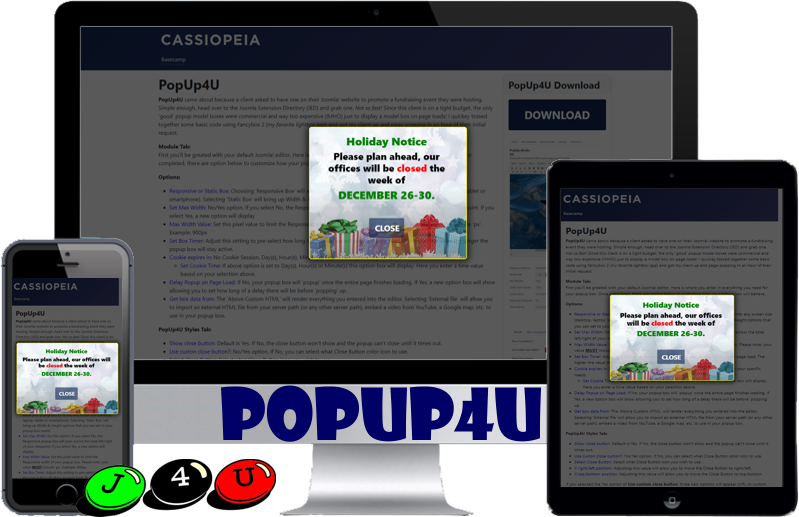 PopUp4U came about because a client asked to have one on their Joomla! website to promote a fundraising event they were hosting. Simple enough, head over to the Joomla Extension Directory (JED) and grab one. Not so fast! Since this client is on a tight budget, the only 'good' popup model boxes were commercial and way too expensive (IMHO) just to display a model box on page loads! I quickey tossed together some basic code using Fancybox 2 (my favorite lightbox app) and got my client up and page-popping in an hour of their initial request.